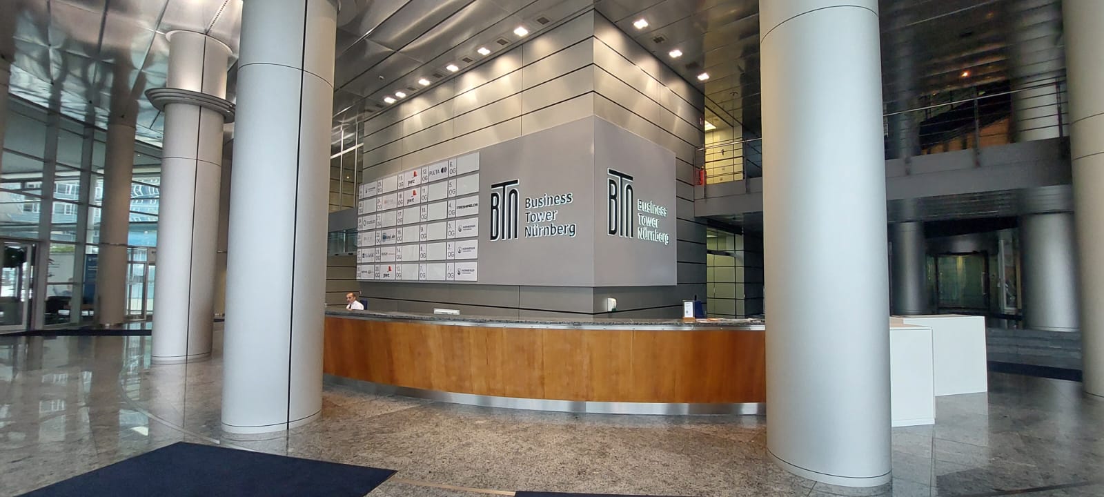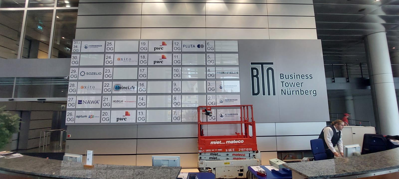 Leuchttransparent inklusive Etageninformation im Empfangsbereich des Towers.